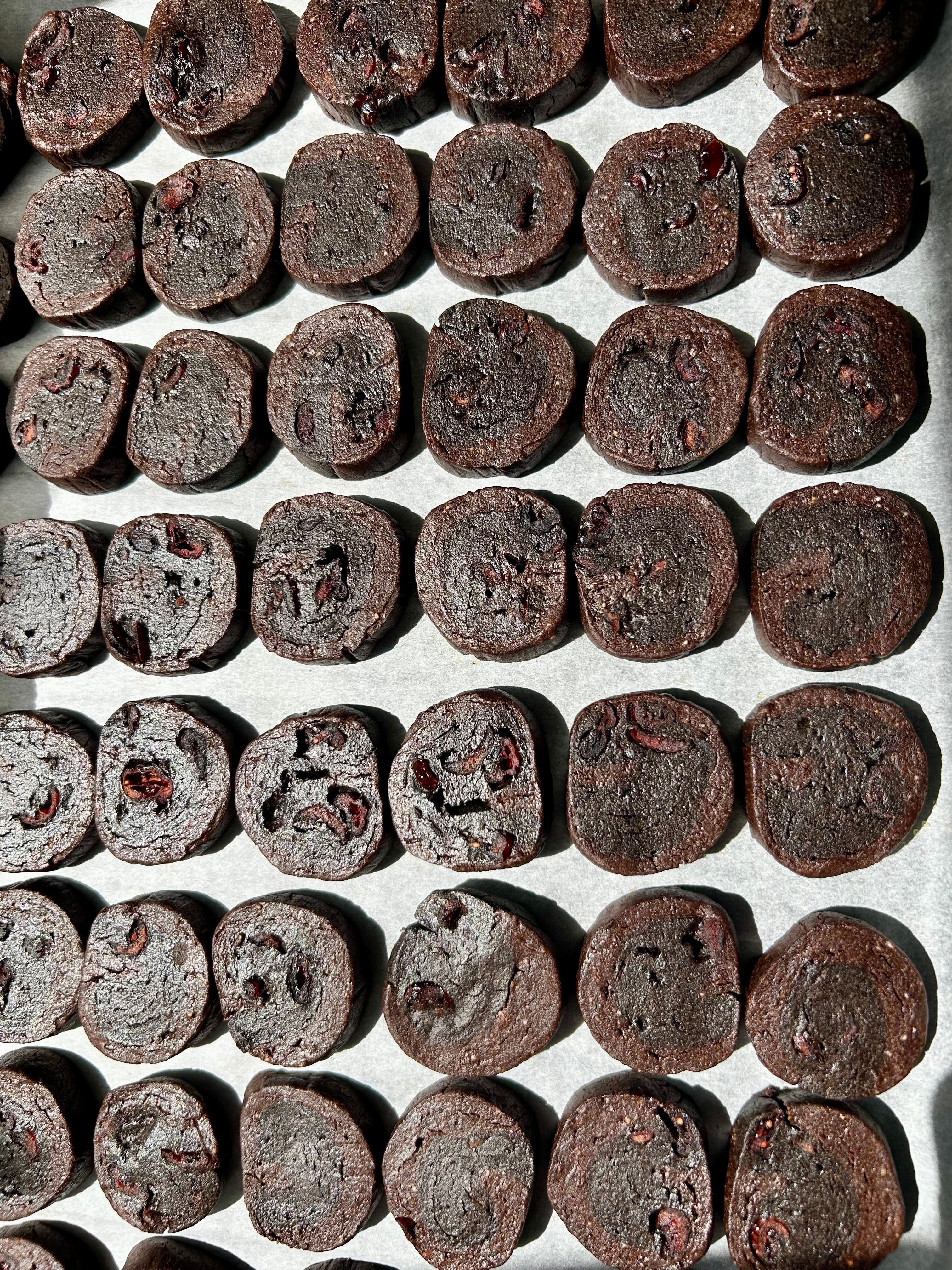 ココアクッキー [栄養成分表示 推定値50gあたり] エネルギー 205kcal たんぱく質4.3g 脂質11.8g 炭水化物(単糖当量)19.1g カリウム288.2mg マグネシウム44mg リン86.4mg 鉄1.3㎎ 亜鉛0.98mg 葉酸45μg 食物繊維4.0g 食塩相当量 0.0g