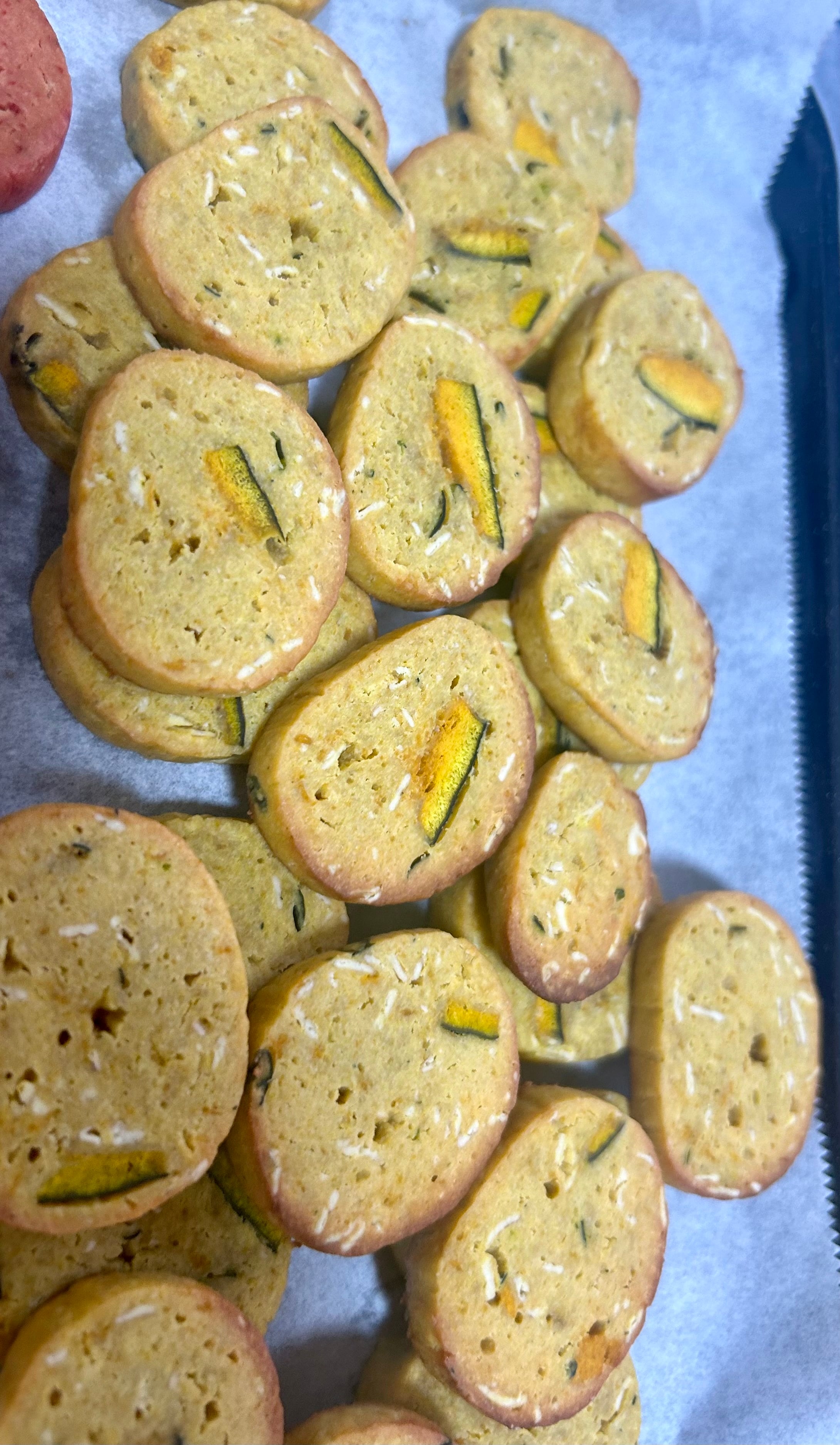 抹茶クッキー [栄養成分表示 推定値50gあたり] エネルギー 199kcal たんぱく質4.6g 脂質10.8g 炭水化物(単糖当量)19.8g カリウム252.1mg マグネシウム34.2mg リン75.1mg 鉄1.1㎎ 亜鉛0.90mg 葉酸73μg 食物繊維4.2g 食塩相当量 0.0g